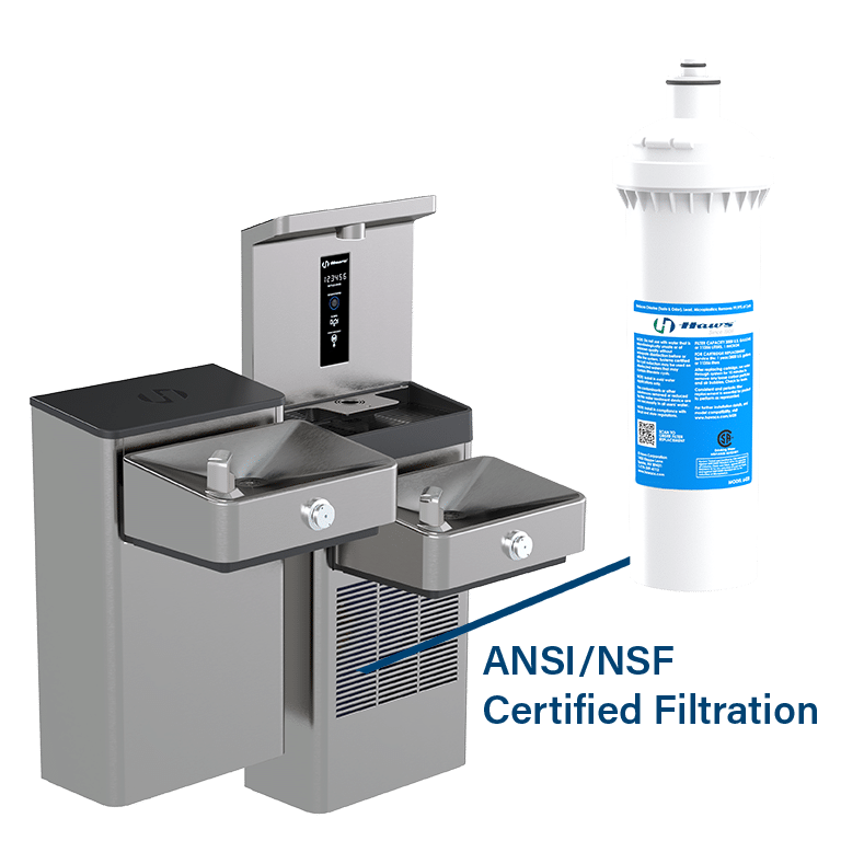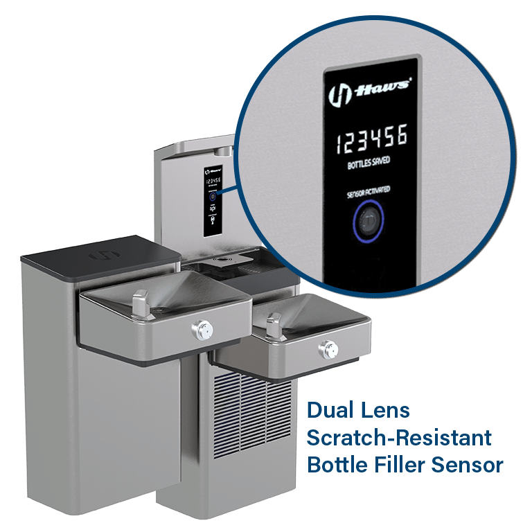 The Haws 1212SFV vandal-resistant bottle filling station with dual ADA fountain provides chilled filtered water through a durable, tamper-resistant design built for indoor spaces. This Hi-Lo (Dual Station) unit meets ADA accessibility standards and includes concealed fasteners and impact-resistant components for long-lasting security. Certified to ANSI/NSF standards, the 1212SFV is ideal for schools, office buildings, and other high-use indoor facilities. Sensor activated bottle filler allows for hands free operation, and intuitive LED electronic display keeps the user informed with how many plastic bottles have been saved.
